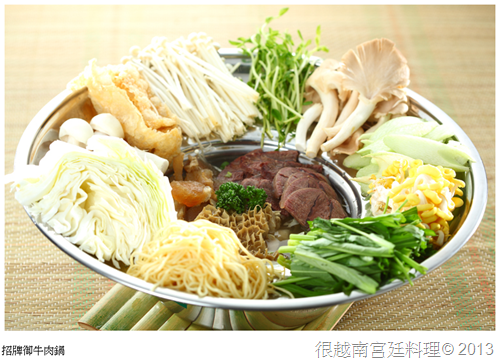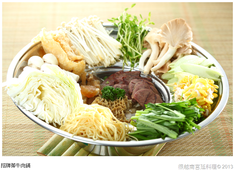 利用牛骨高湯加上越南數十種香料熬煮出上等湯頭,並將上等牛腱、牛筋、牛肚在搭配豐富食蔬與菌菇,就是宮廷流傳的御品牛肉鍋!
